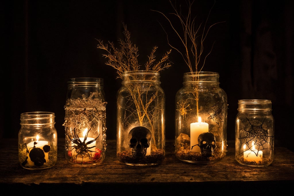 Add Decorative Elements: Place the fillers inside the jars, arranging them around the candles. You can mix and match items to create a spooky effect.