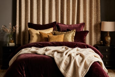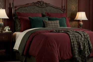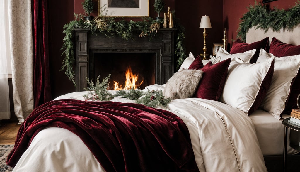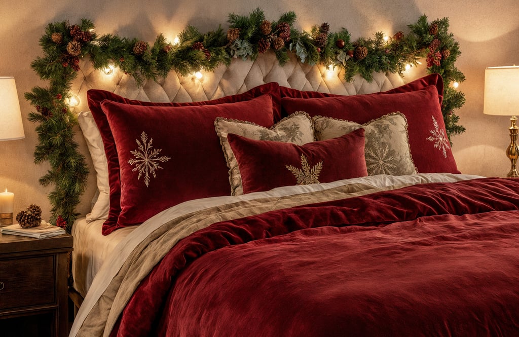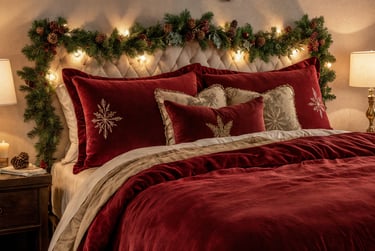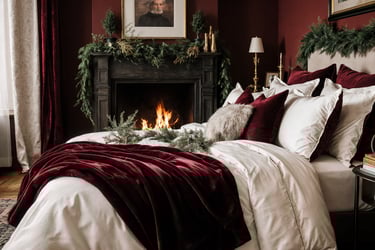 Transform your bed into a winter wonderland with rich velvet textures in deep red. Start with a sumptuous velvet duvet or throw blanket that evokes warmth and elegance. Add an array of plush pillows in complementary shades, such as cream and pale gold, featuring delicate patterns or subtle embroidery. Finish the look with a stunning green garland accented with twinkling lights draped above the headboard, creating a magical, festive ambiance that's perfect for the holiday season.