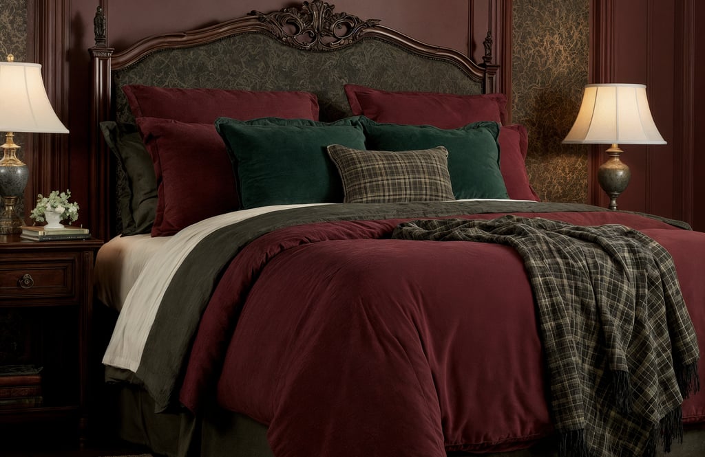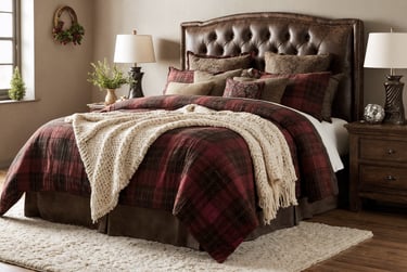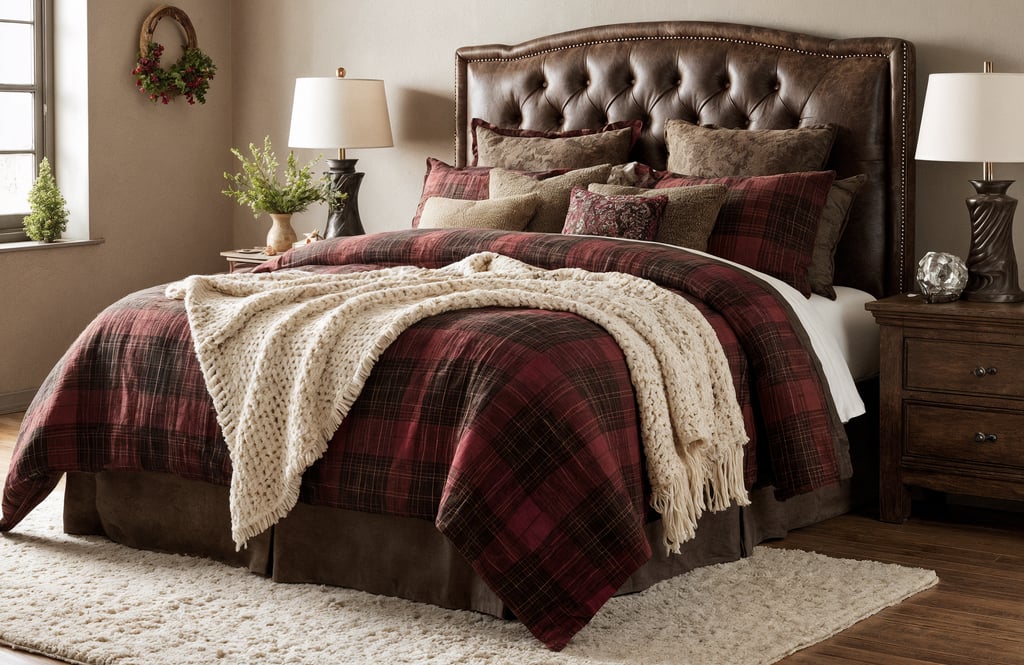 Create a cozy, rustic atmosphere with warm browns and deep reds. Start with a leather headboard that adds a touch of rugged elegance. Style the bed with a deep red plaid duvet cover, layered with brown and cream knit throw pillows to add texture. A chunky cream-colored throw blanket draped over the foot completes the look. Surround this inviting setup with wooden accents, soft area rugs, and holiday-themed decor like pinecones and greenery, enhancing the warm, inviting vibe.