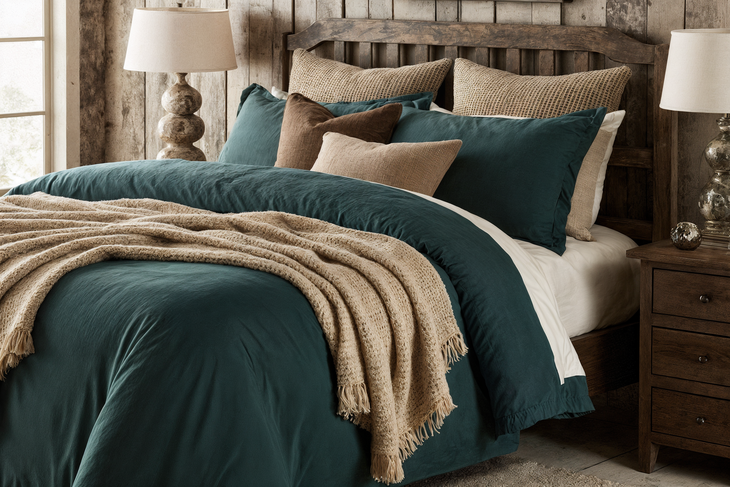 Bring the outdoor magic inside with a palette of deep forest greens paired with earthy browns and rustic woodsy elements. Think of a hunter green comforter, accented with throw pillows in natural fabrics like burlap or linen. Add a chunky knit blanket in an earthy shade, perhaps an oatmeal or taupe, to keep things grounded. This setup is perfect for channeling those cozy cabin vibes and might even inspire you to go for a hike...just kidding, it’s the holidays; stay in bed!