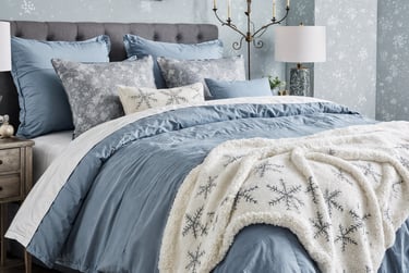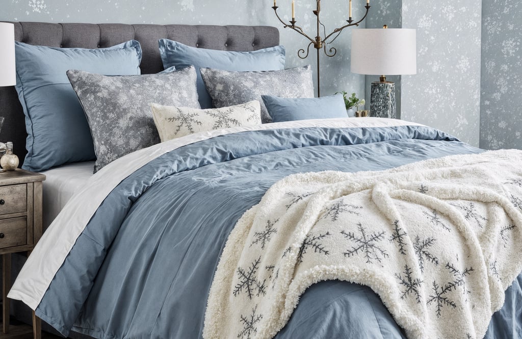 Channel your inner snow queen with soft icy blues and shimmering silver accents. Opt for a frosty blue quilt and toss on a few silver metallic pillows. A plush white throw blanket will add warmth and comfort, consider one with a delicate pattern, like snowflakes or subtle stripes. It’s the perfect blend of elegance and coziness that makes you want to sip hot cocoa while wrapped up like a human burrito.