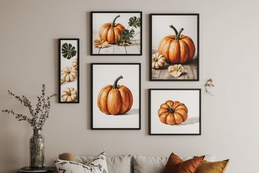 Create a gallery wall featuring pumpkin-themed art. This could include framed prints of pumpkin sketches, vintage pumpkin seed packets or even your own painted pumpkin masterpieces. Mix different frame styles and sizes for an eclectic look that says, “I’m creative but also slightly chaotic.”