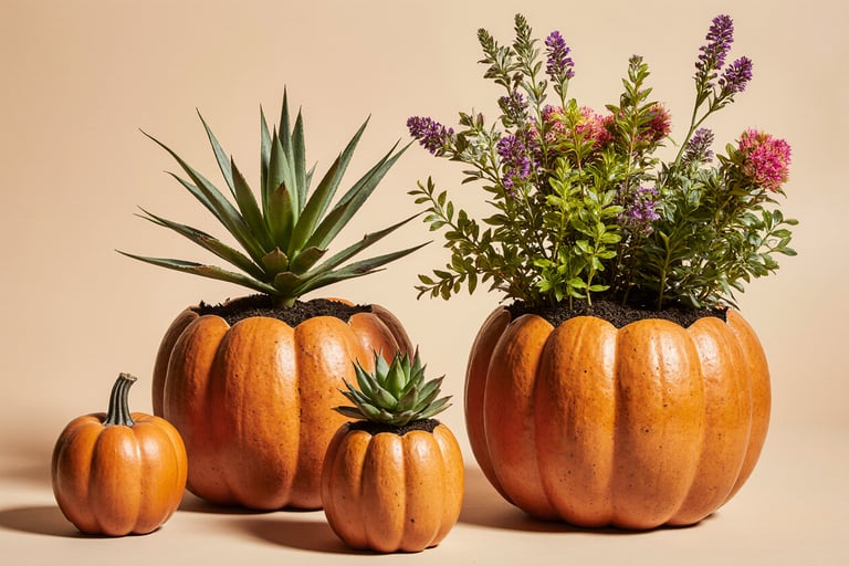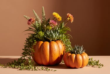 Use hollowed-out pumpkins as planters for seasonal flowers or succulents. It’s like giving your plants a little pumpkin-shaped home. Just line the inside with a plastic bag to keep things tidy and prolong the pumpkin's life, because nobody wants a rotting gourd ruining their aesthetic.