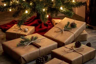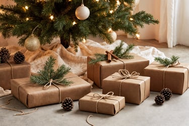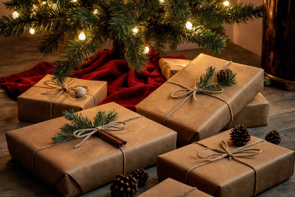 Elevate your gift wrapping with kraft paper, a simple and elegant, biodegradable and recyclable option that exudes understated sophistication. Wrap your presents in this versatile paper and enhance them with natural twine and a sprig of evergreen. This stylish presentation not only looks great under the tree but also aligns perfectly with your eco-conscious ethos, proving that sustainability can be chic.